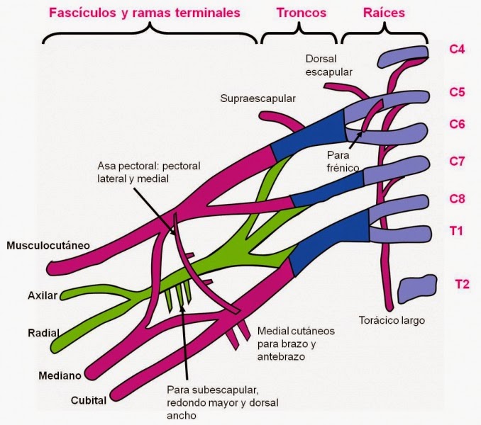 Origen de plexo braquial: en las raíces C5, C6, C7, C8 y T1, con contribuciones ocasionales de C4 y T2.